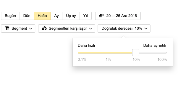 Yandex.Metrica’ya istediğiniz hacimde veriyi gönderin ve verilerinizi istediğiniz gibi kullanın. Rapor için örnekleminizi istediğiniz gibi ayarlayın veya hedef kitlenizin tamamıyla ilgili en doğru sonuçlar elde etmek için %100 veri üzerinde çalışın. Veri hacminiz ne olursa olsun Yandex.Metrica’da veri depolama süresi sınırsızdır.