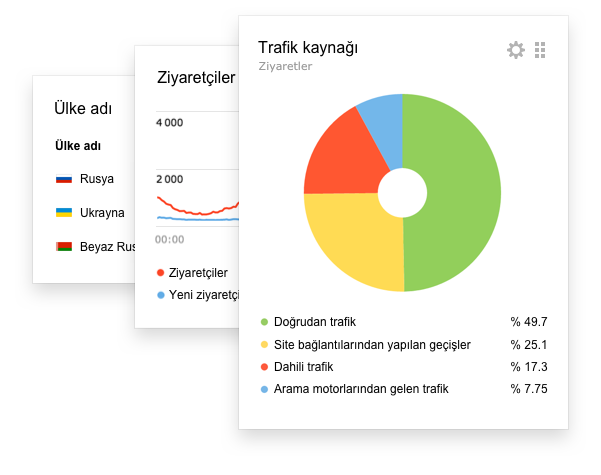 Sitenizin durumunu çabuk değerlendirebilmek için en önemli metrikleri kontrol paneline istediğiniz sırada yerleştirin. Paneldeki metriklerin her biri küçük bir rapor şeklinde düzenlenen bir widget içerisinde görüntülenir. Bu widgette istenilen zaman aralığını, grafik şeklini ve segmenti seçmeniz mümkün.
